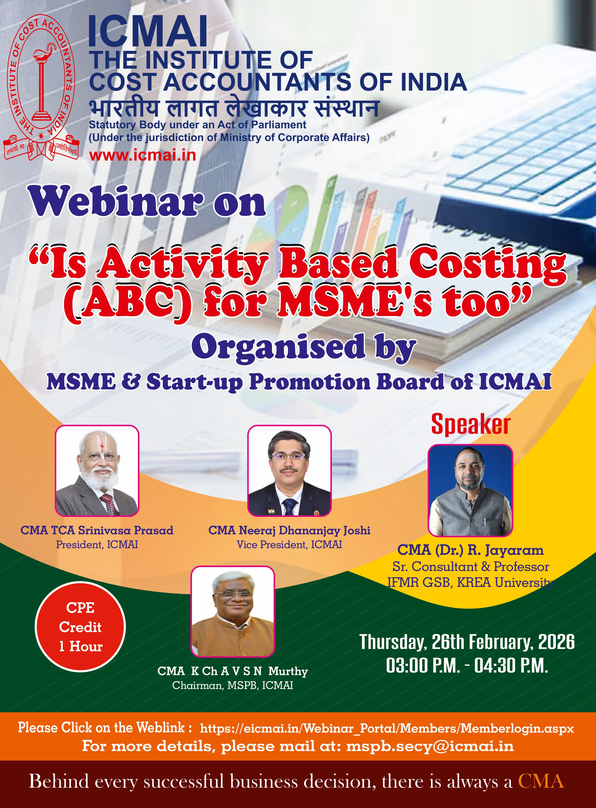 Webinar on " Is Activity based costing (ABC) for MSMEs too " organised by MSME and Start up Promotion Board (MSPB) on 26th February 2026 at 3 pm