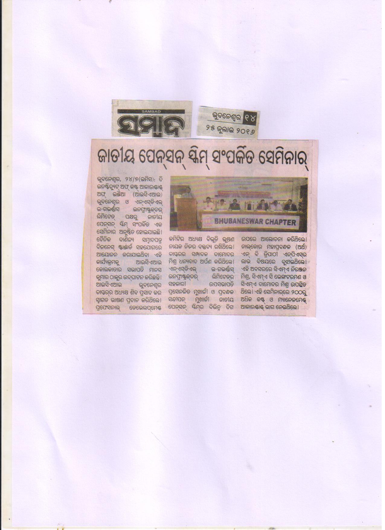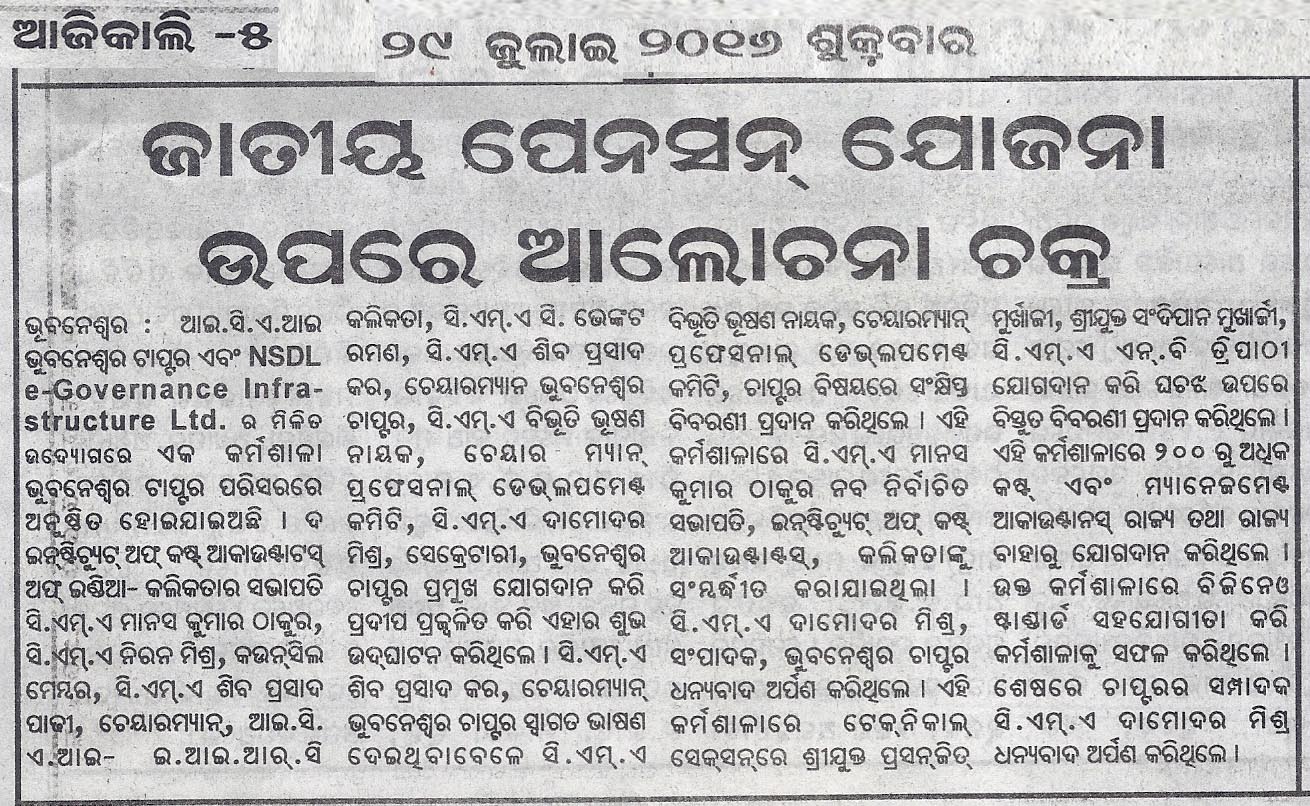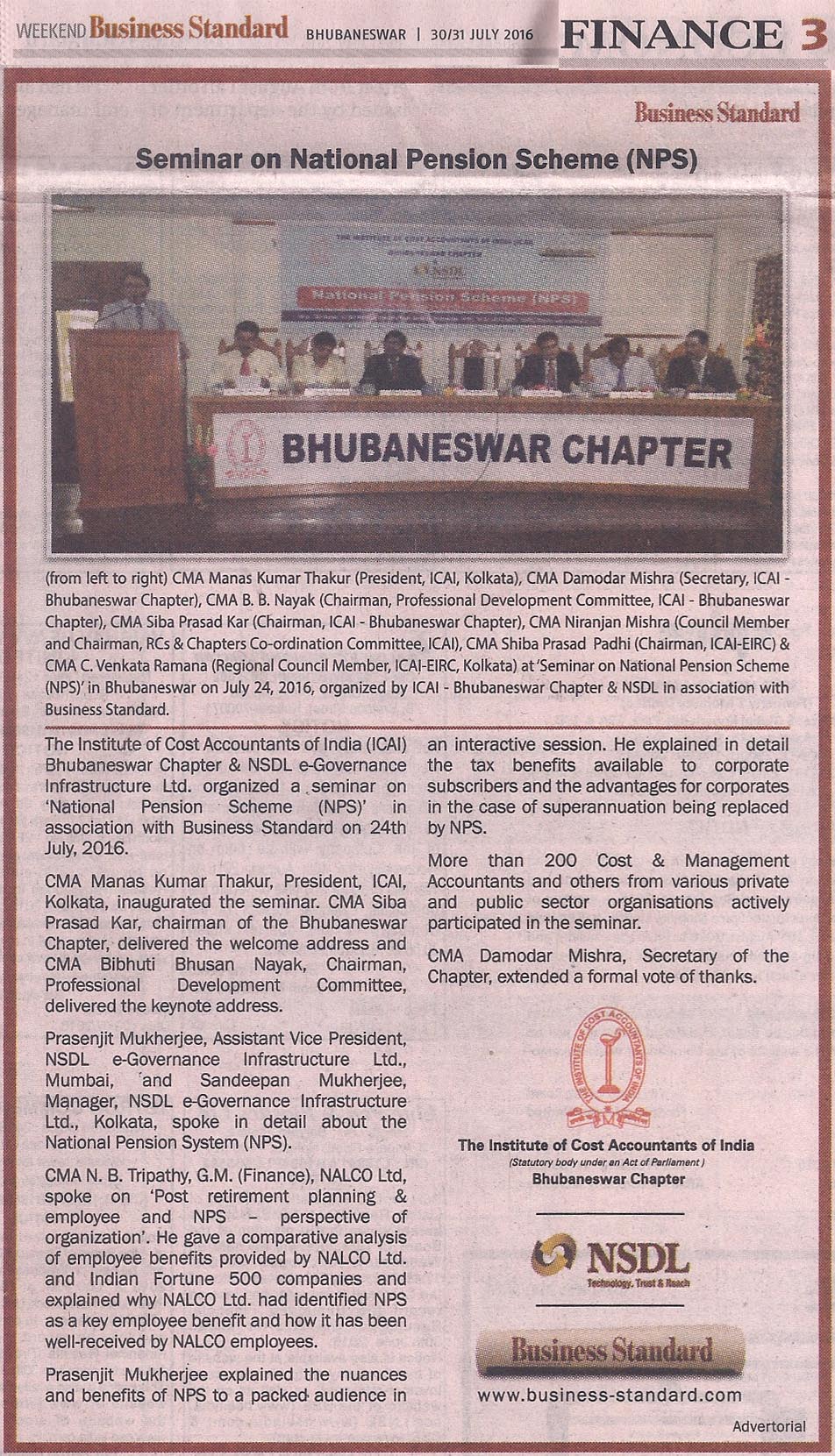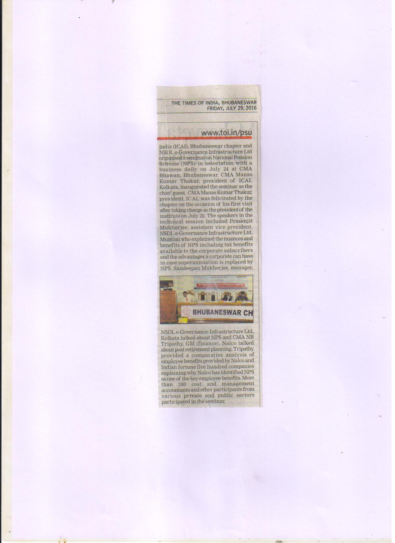 Seminar on “NATIONAL PENSION SCHEME (NPS)” Jointly Organised by The Institute of Cost Accountants of India-Bhubaneswar Chapter & NSDL e-Governance Infrastructure Ltd. in association with Business Standard on July 24, 2016